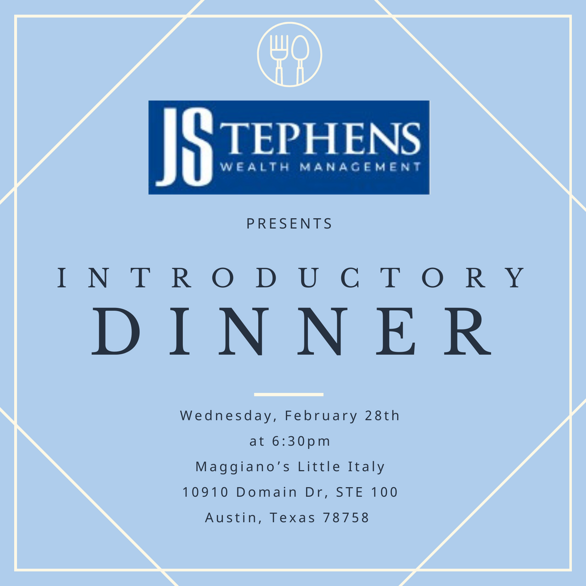 But that’s not all! We encourage you to bring along a referral – someone you believe would benefit from our services. Our introductory dinners provide a warm and inviting atmosphere to meet our knowledgeable staff, ask questions, and discover how JStephens Wealth Management can guide you towards financial security. This event is most relevant to those who are retiring soon or already retired.