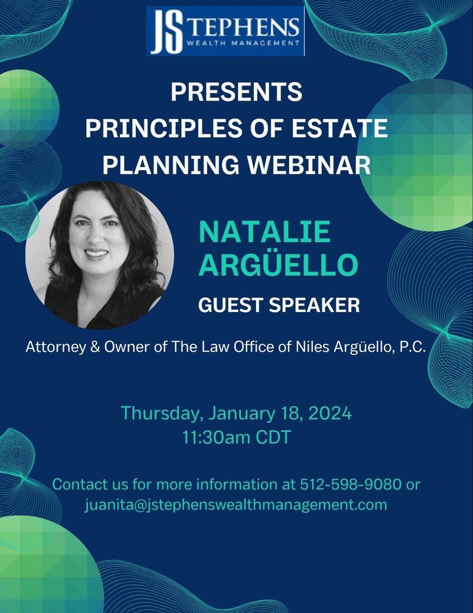 Our guest speaker is Natalie Argüello, Attorney and Owner of The Law Offices of Niles Arguello, P.C. For more than 20 years, Natalie Argüello has focused her career on supporting justice and equality for those in need. She is a civil attorney practicing primarily in the areas of wills, estate planning, probate, civil litigation, family law, and business development & transactions. She also has helped clients in the areas of real estate, entertainment, IP protection, school law, and non-profit governance. She is a mediator certified to mediate all kinds of disputes, including family law.