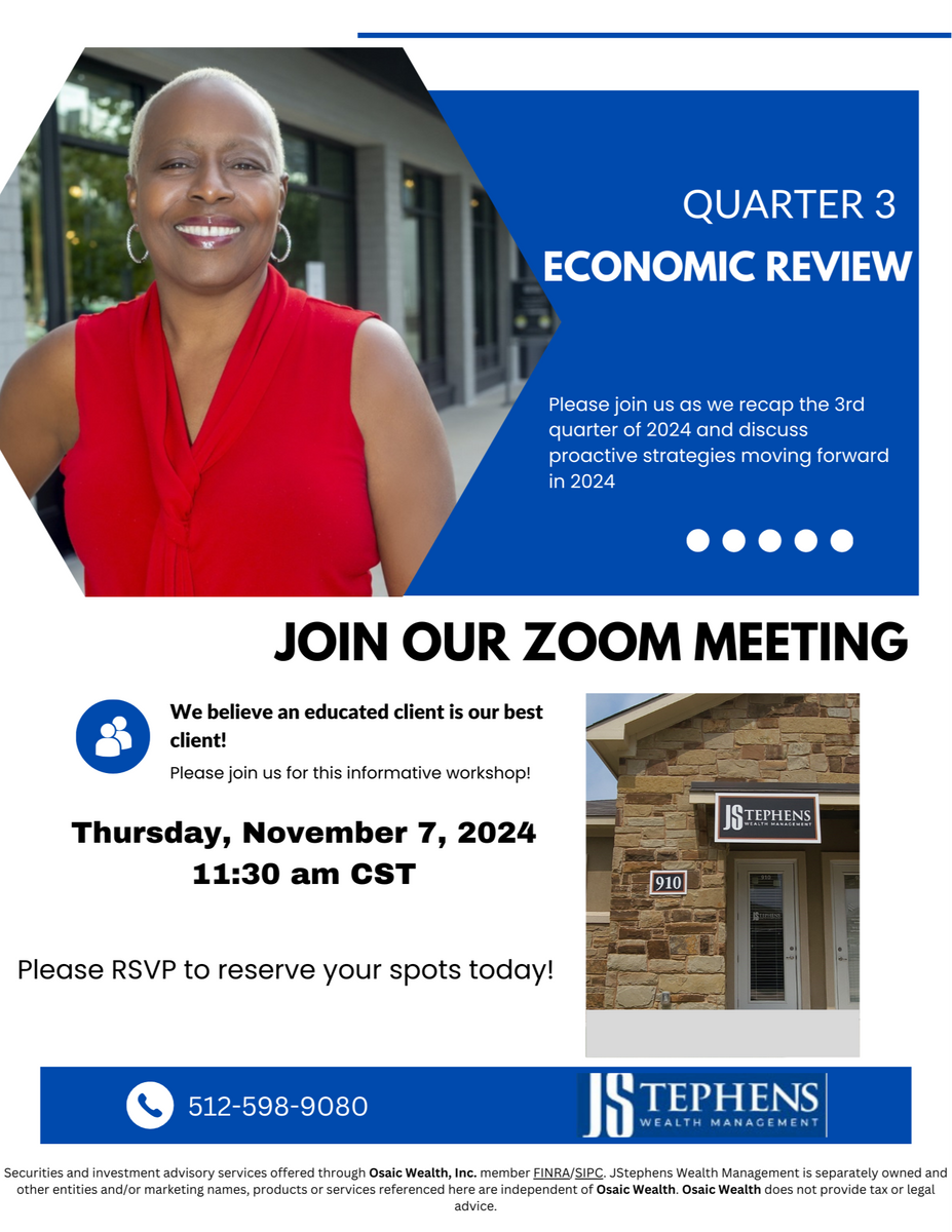 Please join us for our upcoming Quarter 3 2024 Economic Update. We'll be answering some of your most pressing questions, taking a brief look at recent market behavior, and reviewing how we're continuing to serve you and your financial strategy. Feel free to invite your friends and loved ones.
