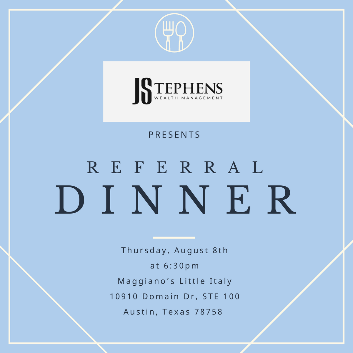 But that’s not all! We encourage you to bring along a referral – someone you believe would benefit from our services. Our referral dinners provide a warm and inviting atmosphere to meet our knowledgeable staff, ask questions, and discover how JStephens Wealth Management can guide you towards financial security.